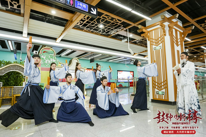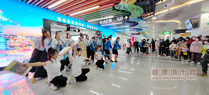 元旦当天上午,在佛山地铁3号线大良钟楼站,多名书生扮相的演员,手拿书简,在人群中汇聚到一起,演绎了古代拜师学艺的场景;在顺德欢乐海岸站,多名穿着校服的演员手持书本,随着音乐现场舞动,吸引了广大游客和市民现场驻足观看……