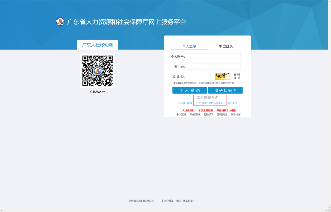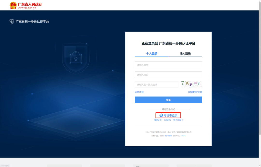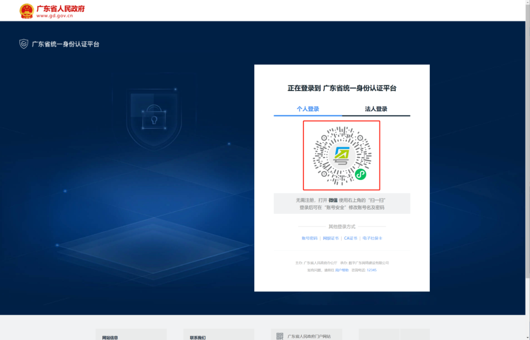 优先推介使用“广东省统一身份认证平台”进行登录,然后使用手机微信扫描跳转页面中出现的小程序葵花码,按照手机页面指引刷脸认证,即可免注册登录。