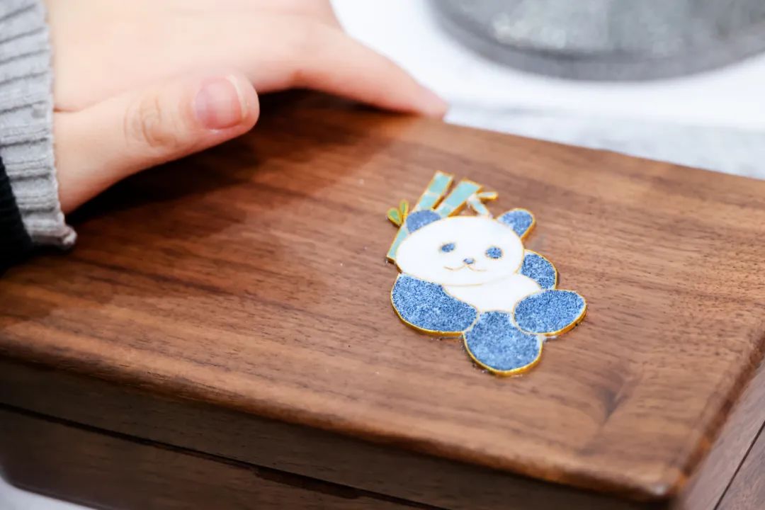 掐丝珐琅是以传统景泰蓝(珐琅)工艺为基础创新而来的艺术形式,通过将金属丝线掐制成图案轮廓,再填充釉料或现代彩砂而制成。制作工序主要包括拓印、掐丝、点蓝、找平、上胶五个步骤。