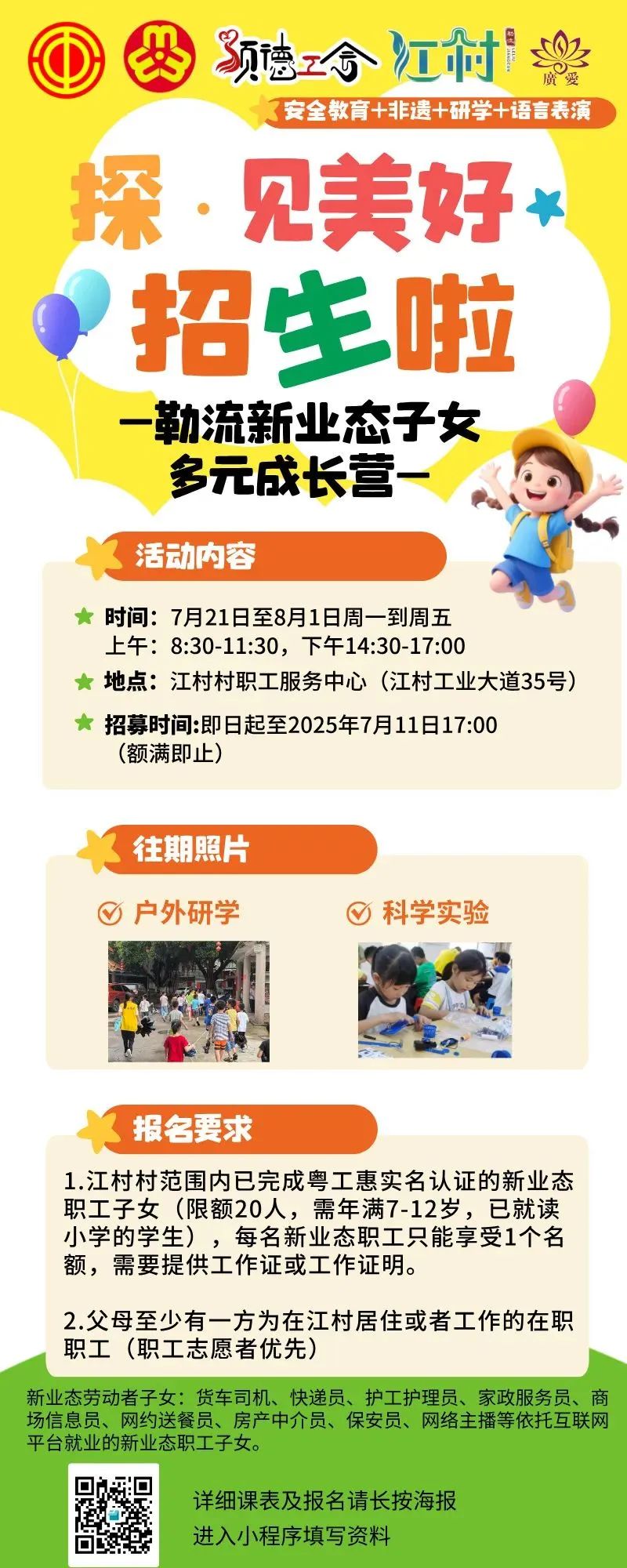1.勒流江村村范围内已完成粤工惠实名认证的新业态职工子女(限额20人,需年满7-12岁,已就读小学的学生)每名新业态职工只能享受1个名额,需要提供工作证或工作证明。