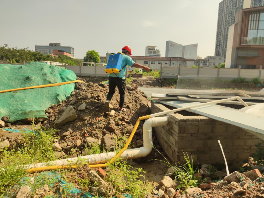 建立“日常消杀+重点防控”机制——每日伊蚊活跃时间开展2次全域消杀,难排积水区每周投放2次灭蚊药;给工人发驱蚊液、要求穿长袖,每日测温,严防蚊虫近身。