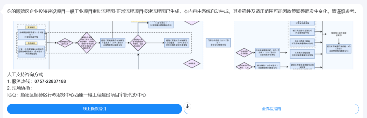 其中“一企一图”模块堪称政务服务的“智能导航系统”:基于基坑支护和土方开挖、桩基础工程等5个施工许可证的7种组合形式,结合一般工业、房屋建筑、旧厂房改造等项目类型,顺德精心绘制23张差异化审批流程图。这些流程图不仅清晰呈现从立项到竣工的全流程脉络,更精准标注每个环节的办理时限与申报材料清单。