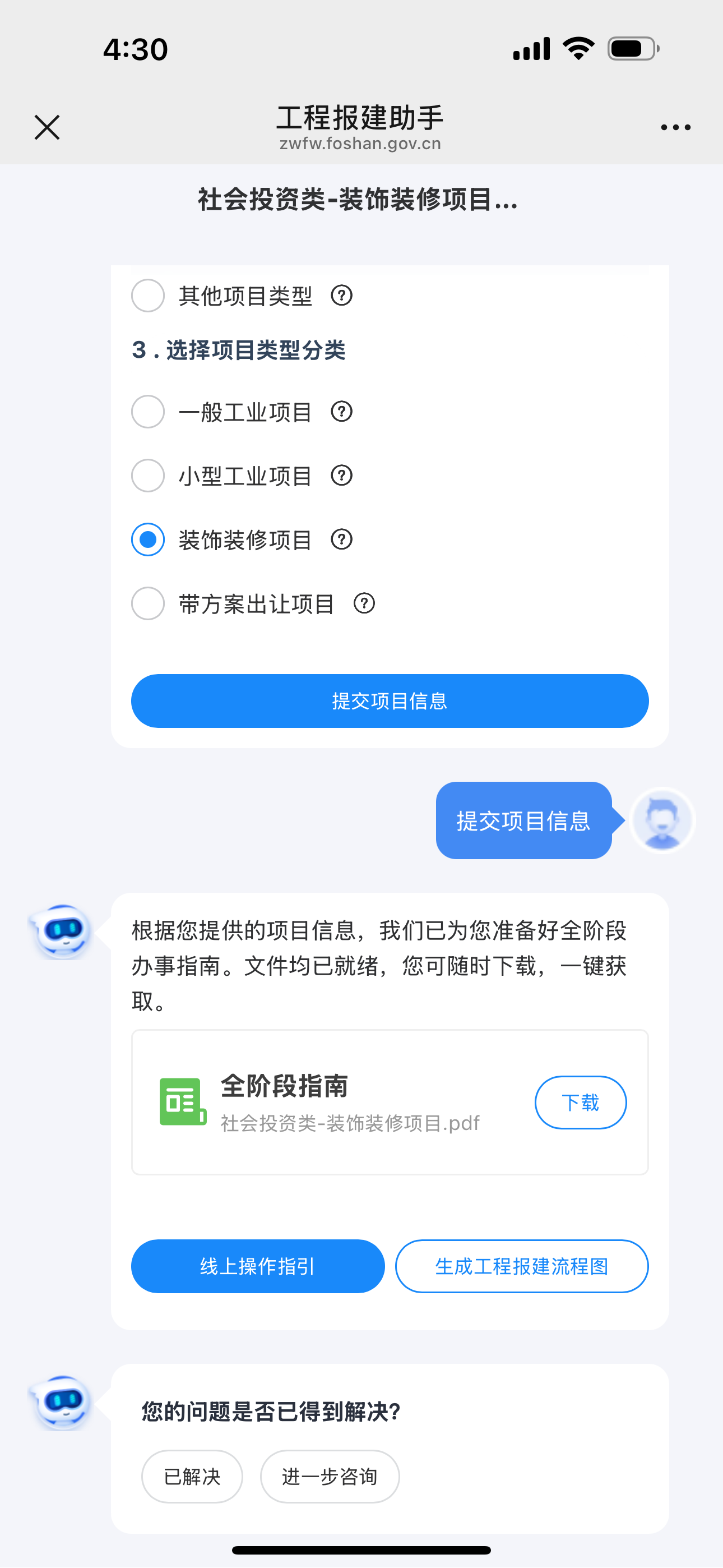 服务专区设在“顺德政务百事通”官方微信菜单栏的“工程报建助手”。企业只需输入项目需求,系统便可自动匹配专属“报建路线图”和“材料包”,真正实现“一图在手、心中有数”。