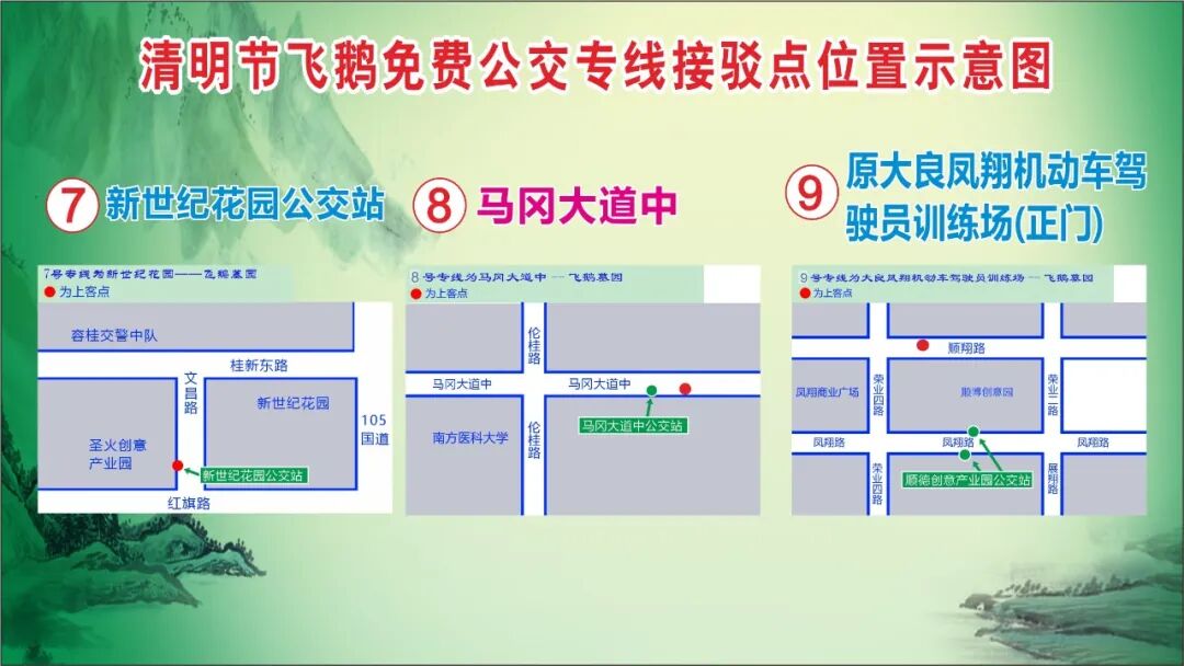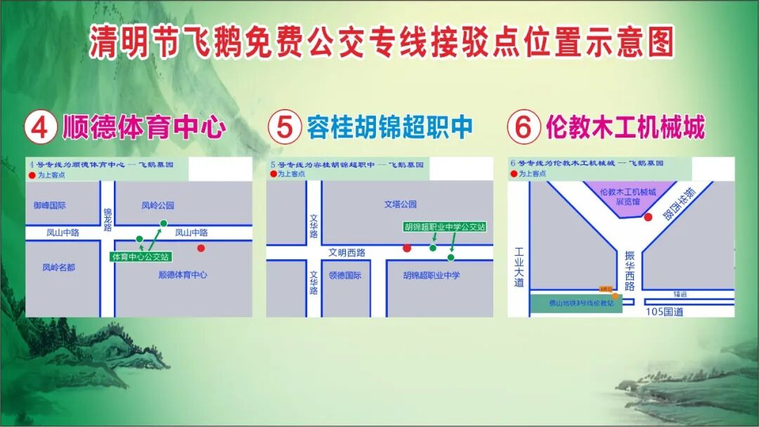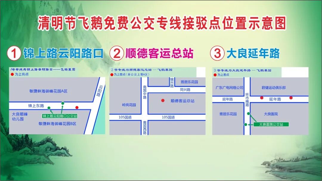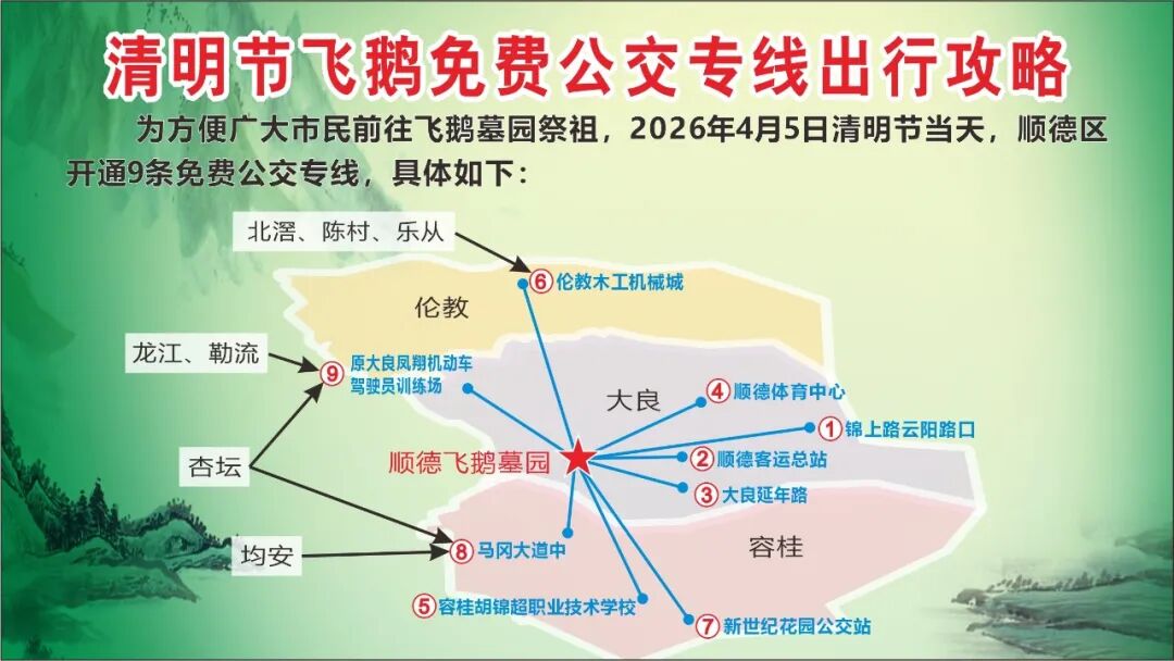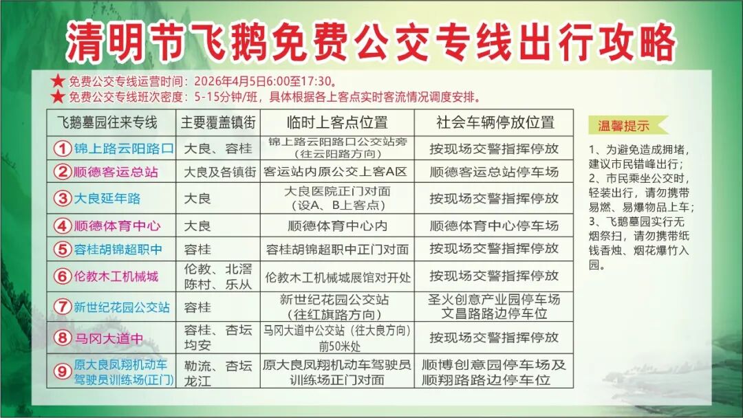 清明将至,为方便市民祭扫出行,顺德区将于今年清明节期间开通免费公交专线前往大良飞鹅墓园。其中,4月5日清明节当天将开通9条专线直达大良飞鹅墓园,4月6日、11日、12日则每日各开通1条专线,为市民提供便捷、绿色的出行选择。
