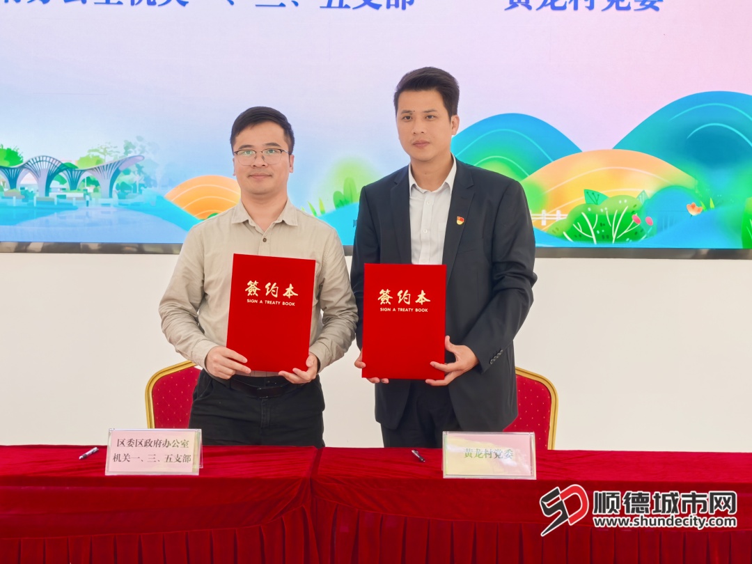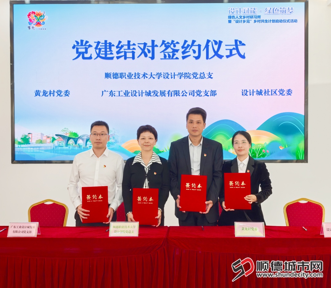 区委区政府办公室机关一、三、五支部与黄龙村党委开展党建结对共建。顺德职业技术大学设计学院党总支分别与黄龙村党委、设计城社区党委、广东工业设计城发展有限公司党支部签订党建结对协议。这标志着政、校、地、企、社多方协同助力乡村振兴的协同机制正式建立。