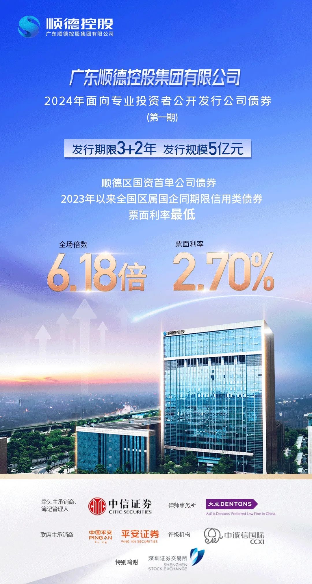 近日,广东顺德控股集团有限公司首次面向专业投资者公开发行公司债券在深交所成功发行。本期债券发行规模5亿元,发行期限3+2年,全场倍数6.18倍,票面利率2.70%,创全国区属国企2023年以来同期限信用类债券票面利率最低。此次发行的债券亦是顺德国资首单公募公司债,本期较高的认购倍数体现了资本市场对顺德区国有企业的认可。