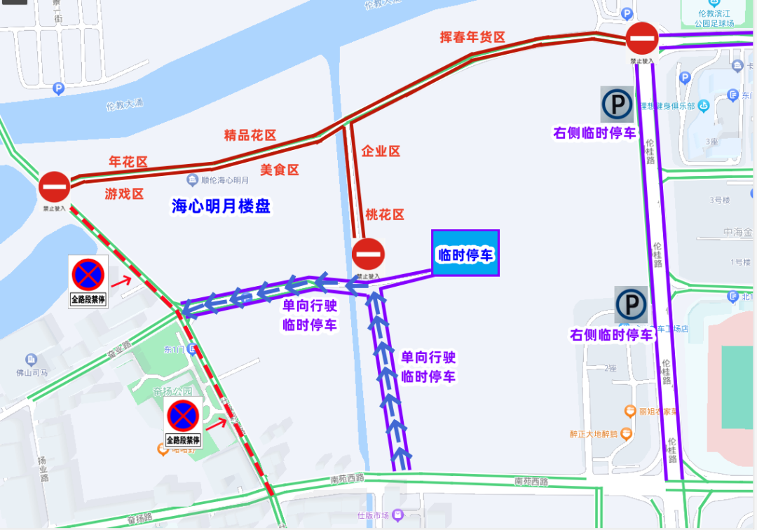 1月30日22时起,伦桂路丽港豪园对开路段为停车路段,在花市营业活动进行慢车道停放车辆,人行道可停放非机动车;