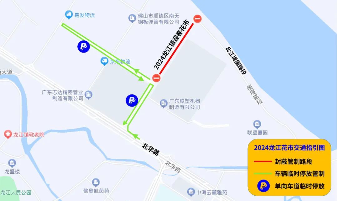 花市期间,将对龙江镇大坝工业区纬五路实施临时交通管制。其中,北华路入口至志达北侧路口段实施车辆临时停放管制;志达北侧路口至北江堤围段实施封闭管制,禁止一切非执勤或应急车辆通行。