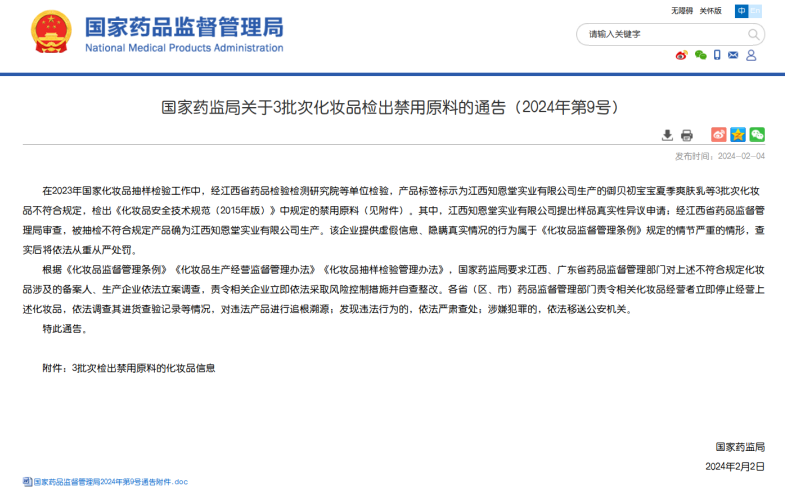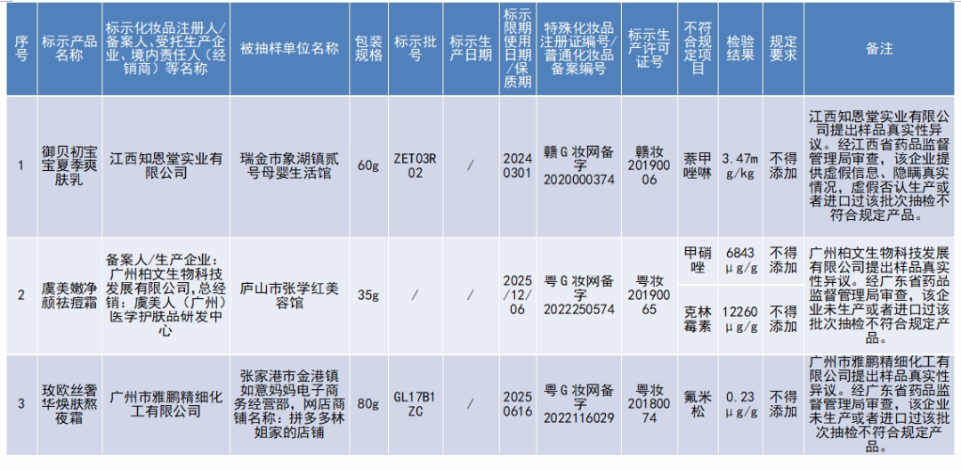 其中,江西知恩堂实业有限公司提出样品真实性异议申请。经江西省药品监督管理局审查,被抽检不符合规定产品确为江西知恩堂实业有限公司生产。该企业提供虚假信息、隐瞒真实情况的行为属于《化妆品监督管理条例》规定的情节严重的情形,查实后将依法从重从严处罚。