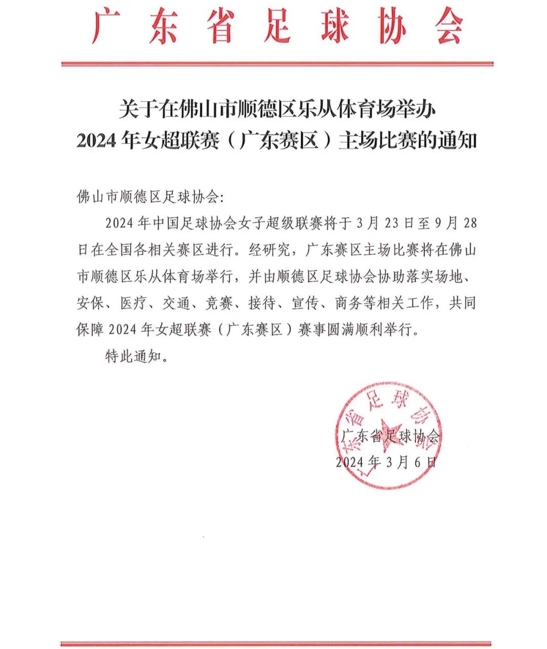 2024中国太平中国足球协会女子超级联赛将于3月23日至9月28日在全国各赛区进行。新赛季的广东女足主场落户顺德,队伍将在乐从体育场开展11场的主场比赛,对手包括武汉车谷江大女足、上海农商银行女足、长春大众卓越女足、江苏无锡女足、北京女足、山东体彩女足、杭州银行女足、永川茶山竹海女足、河南万仙山女足、陕西志丹女足、海南琼中女足。