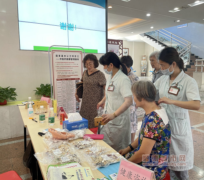 知识讲座之后,陈玉聪和其他家庭医生团队的医护人员现场开展健康咨询,并提供艾灸、刮痧、耳穴压豆等现场治疗服务。