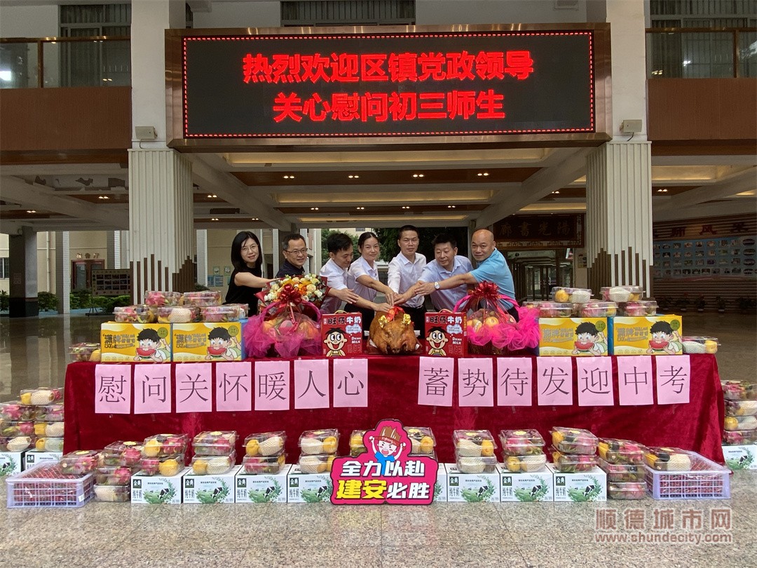 5月20日上午,顺德区委常委、均安镇委书记吴永科带队慰问均安中学、光正实验学校、文田中学、建安中学等学校高三、初三毕业班的师生,为师生加油鼓劲。均安镇委副书记、镇长黄东青,镇人大主席冯炳全,区教育局机关党委专职副书记朱文彬,镇党委副书记梁伟文,镇党委委员刘璟瑜等领导陪同参加了慰问活动。