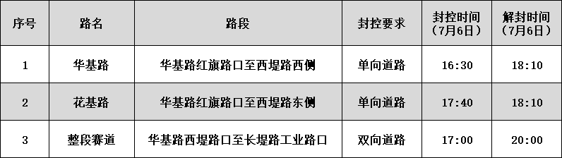 ②2024年7月6日16:30至18:10,华基路红旗路口至西堤路西侧(起点)禁止其他车辆驶入;