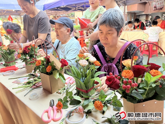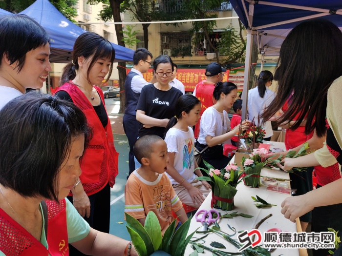 在家国同庆之创美丽庭院摊位前,大家在园艺师的带领下,根据自己的喜好和自由创意,制作出一盆盆独具匠心的花艺作品;还有DIY手作摊位,大家自由选择木质灯笼或者立体书签进行DIY创作,通过一边制作一边讨论心得,现场热闹非凡,展现了邻里和谐、群心向党的社区氛围。