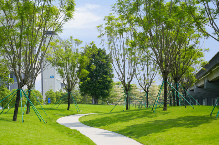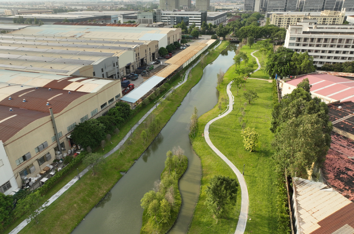 鸡肠窖河景观工程主要由横跨中间的兴隆五路分为南北两段。北段与科达、奔朗等企业产区相接壤,利用周边厂区的空闲绿地,营造花园式厂区风貌环境,同时提升工业区的公共环境设施,打造一个通透、舒朗、自然简约的工业绿芯。