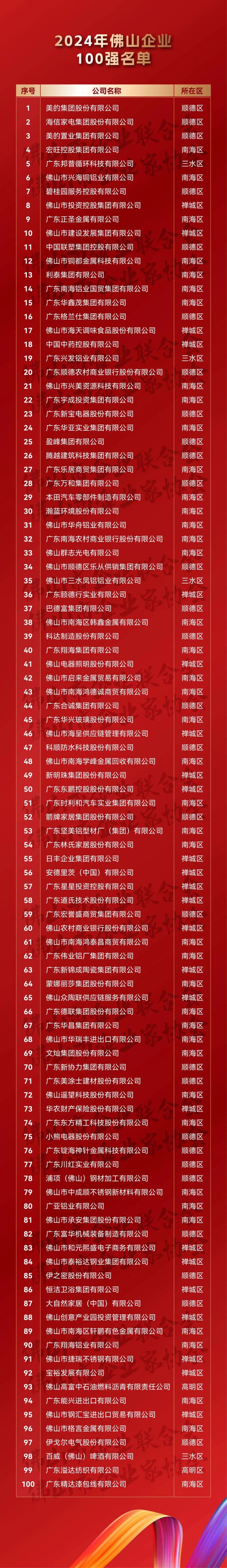 其中,2024年佛山企业100强名单中,顺德有28家。2024年佛山制造业100强名单中,顺德有40家。2024年佛山民营企业100强名单中,顺德有32家。