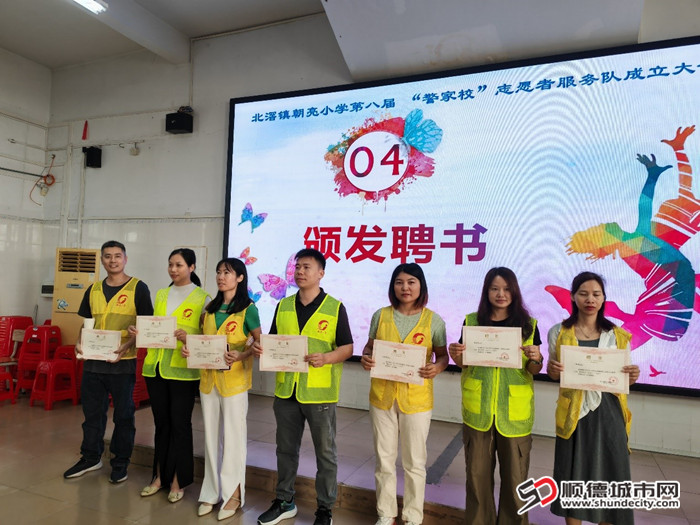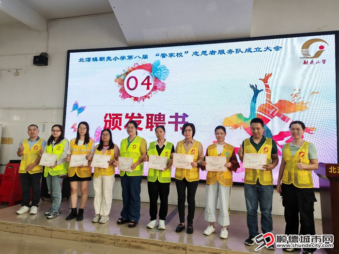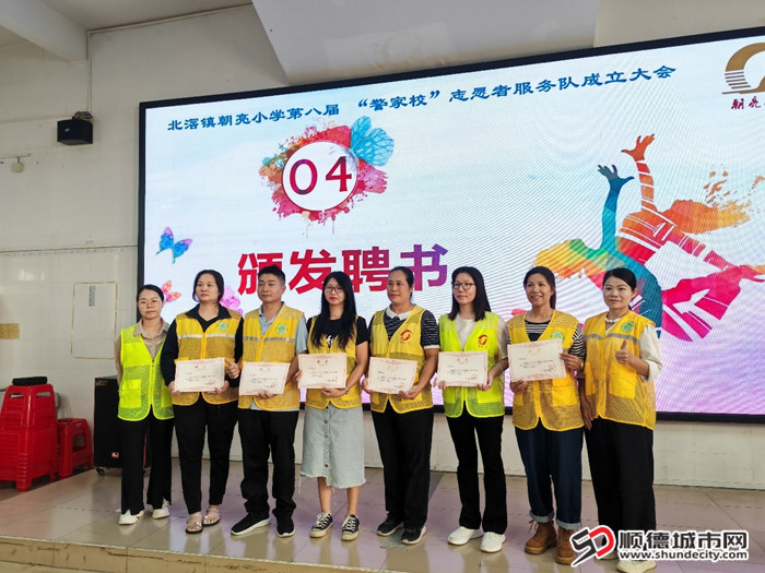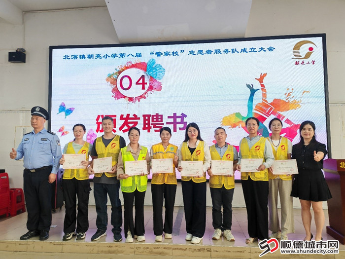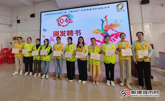 北滘镇志愿者联合会会长罗文冬为朝亮小学家长志愿者授队旗