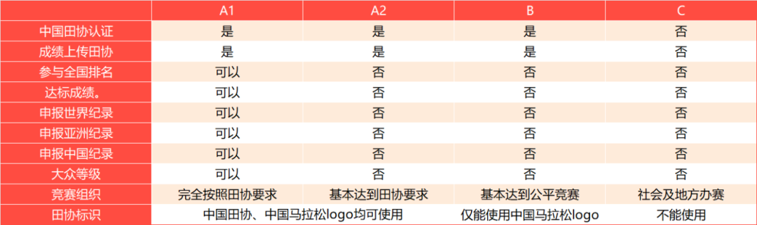 A1类、A2类、B类赛事为中国田协认证赛事,C类赛事不是中国田协认证赛事,为属地办赛。
