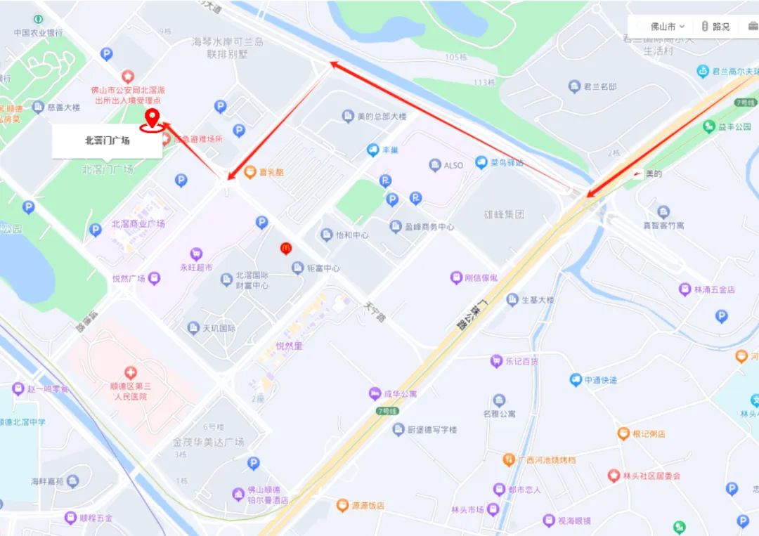 路线:105国道→美的大道→诚德路→天宁路→北滘门广场