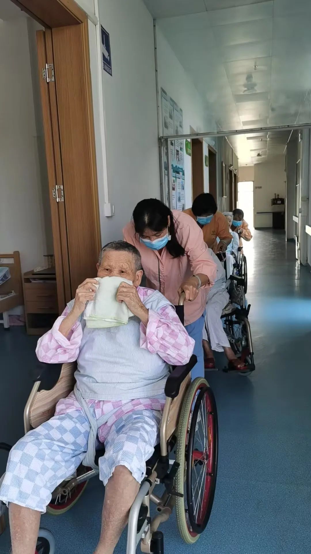 工作人员迅速安排入住长者进行有序疏散,引导长者用湿毛巾捂住口鼻俯身通过消防通道撤离至安全集合点。对于行动不便的长者及伤病人员,由医务人员使用轮椅及车床协助有序疏散。