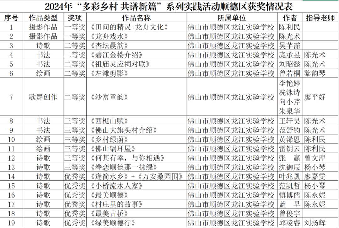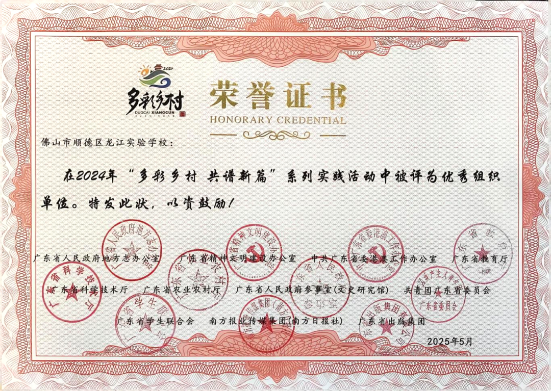 近日,由广东省教育厅等11家省直辖单位联合组织的2025年“多彩乡村,共谱新篇”系列实践活动圆满收官。龙江实验学校师生在本次活动中表现卓越,荣获19项荣誉,成为全区获奖数量最多的学校!其中,一等奖2名、二等奖5名、三等奖5名、优秀奖7名,学校还获评优秀组织奖。
