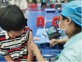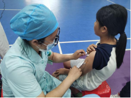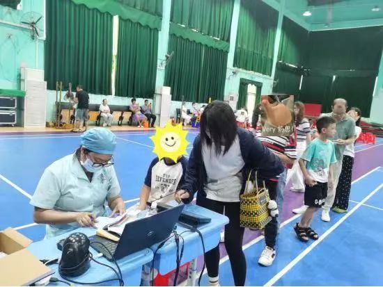 学生在老师和医护人员的鼓励下表现得非常积极,勇敢伸手臂,变身“健康小勇士”。