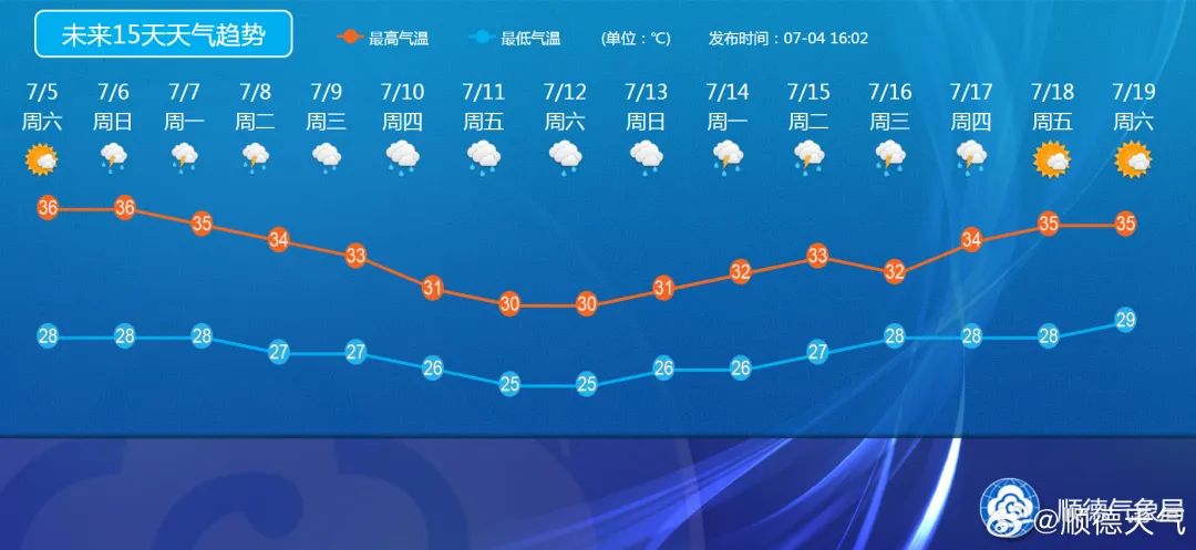 预计5日晴间多云,最高气温约36度,6到7日有分散雷阵雨,8到9日有雷阵雨、局部大雨,展望10到11日有中到大雨。