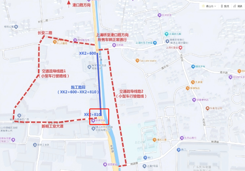新明路(上涌桥头-新明工业大道)全封闭施工,计划时间2025年7月19日至2025年8月19日。小车、非机动车建议绕行路线为:上涌村内部道路、新明村内部道路或其他市政道路。
