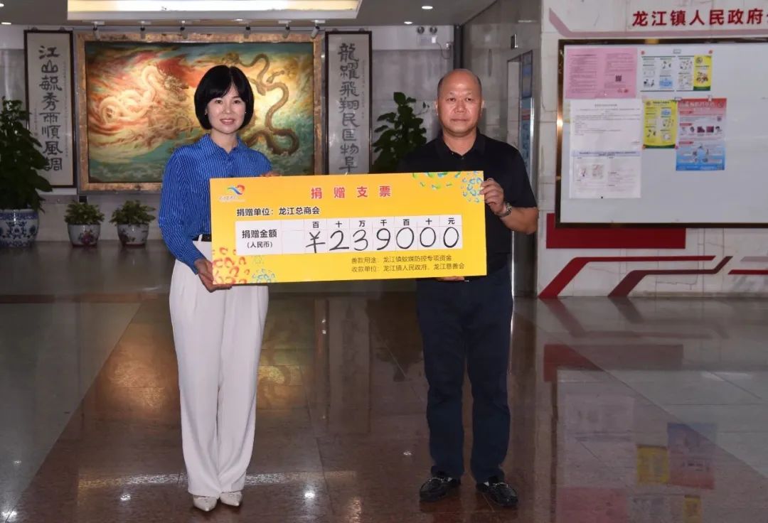 7月22日上午,龙江镇举行蚊媒防控专项资金捐赠仪式。龙江总商会常务副会长黄伟华代表龙江总商会向龙江镇蚊媒防控专项资金捐赠首批资金239000元。龙江镇党委副书记、镇长俞飞燕代表接收。
