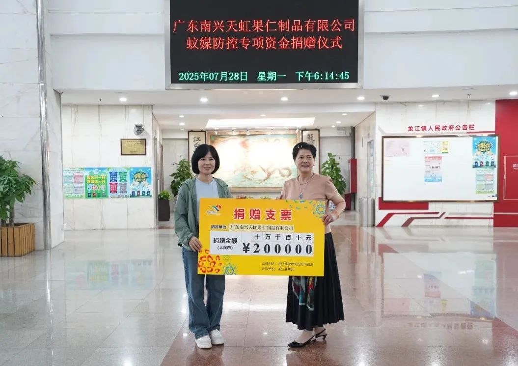7月28日,龙江总商会会长、广东南兴天虹果仁制品有限公司董事长邓惠娟向龙江镇蚊媒防控专项资金追加捐赠20万元。龙江镇党委副书记、镇长俞飞燕代表接收。