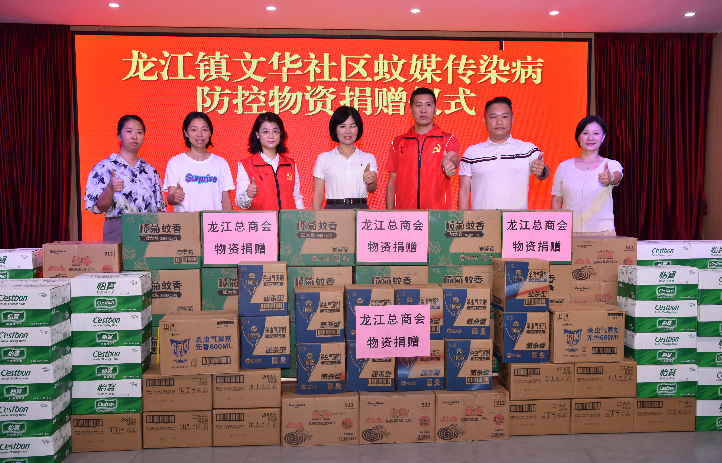 7月24日上午,龙江镇蚊媒传染病防控物资捐赠仪式在文华社区举行。龙江镇党委副书记、镇长俞飞燕,各捐赠单位代表,以及驻村负责人、文华社区相关负责人共同出席活动。龙江总商会监事长蔡必挺、秘书长梁嘉英代表龙江总商会向文华社区捐赠物资。