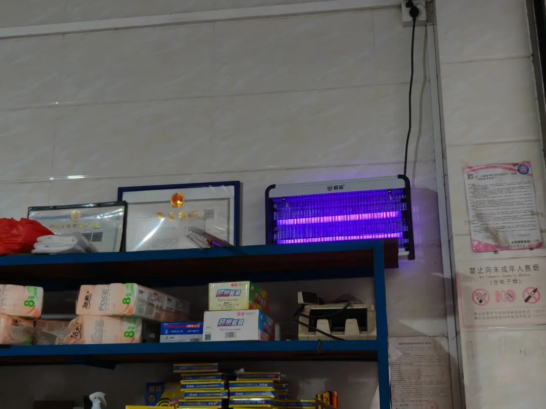 在附近的药店同样安装上灭蚊灯。“目前周边商铺应该都已经安装了灭蚊灯。这是村委会送过来的。”药店工作人员说道。“现在公共场所装有灭蚊灯,加上每天消杀,蚊虫很少见了。”