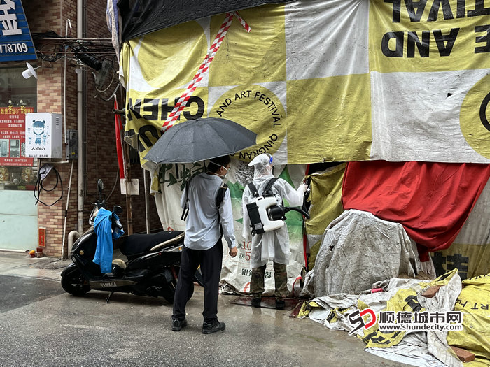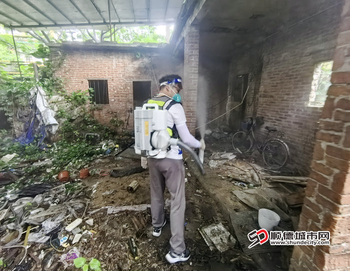 顺德区发展和改革局机关党委的党员尹文达与消杀队员一起,控制好消杀质量。