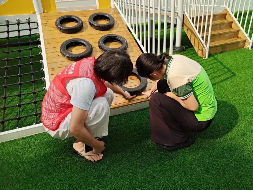 课堂结束后,龙江镇健康共同体医护人员与托幼机构老师们一起到办公区、运动场、花园等场所查看积水的情况。