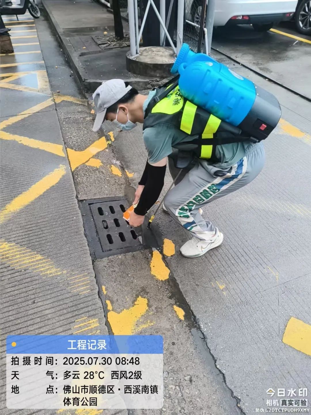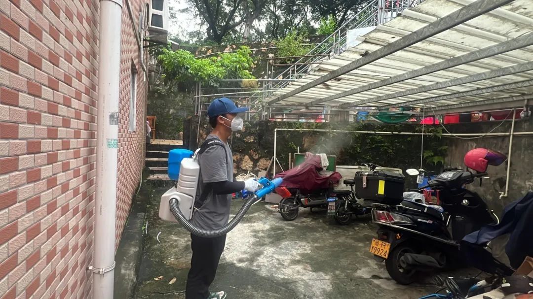 下午5:00,暑气未消。大家再次全副武装,重点转向蚊虫栖息的阴暗角落——房檐下、灌木丛、废弃容器堆积处。滞留喷洒药剂(如氯菊酯等)被精准附着于墙面地表,形成持久防护屏障。夜幕渐垂,头灯的光柱划破黑暗,器械的嗡鸣是守护的誓言。