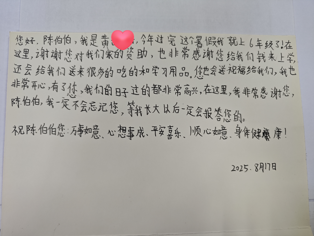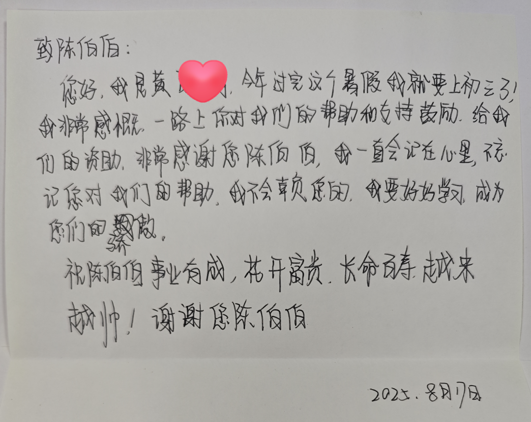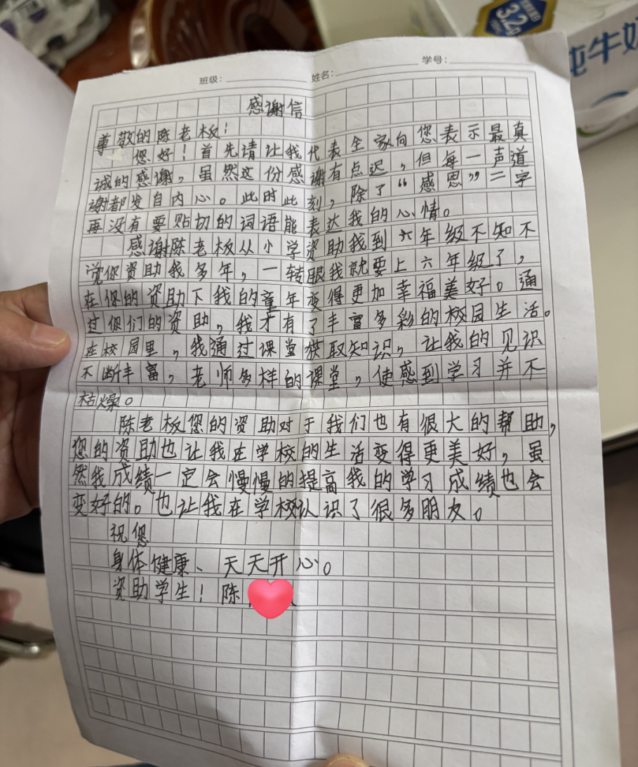 面对陈先生一直以来的帮助与鼓励,学子们深受感动,纷纷表达了自己的感激之情,还特意拿出了精心准备的感谢信。信中,孩子们用稚嫩却真挚的文字,向陈先生汇报了自己的学业成绩,分享成长的喜悦,并真挚感谢他的无私的关怀与帮助。