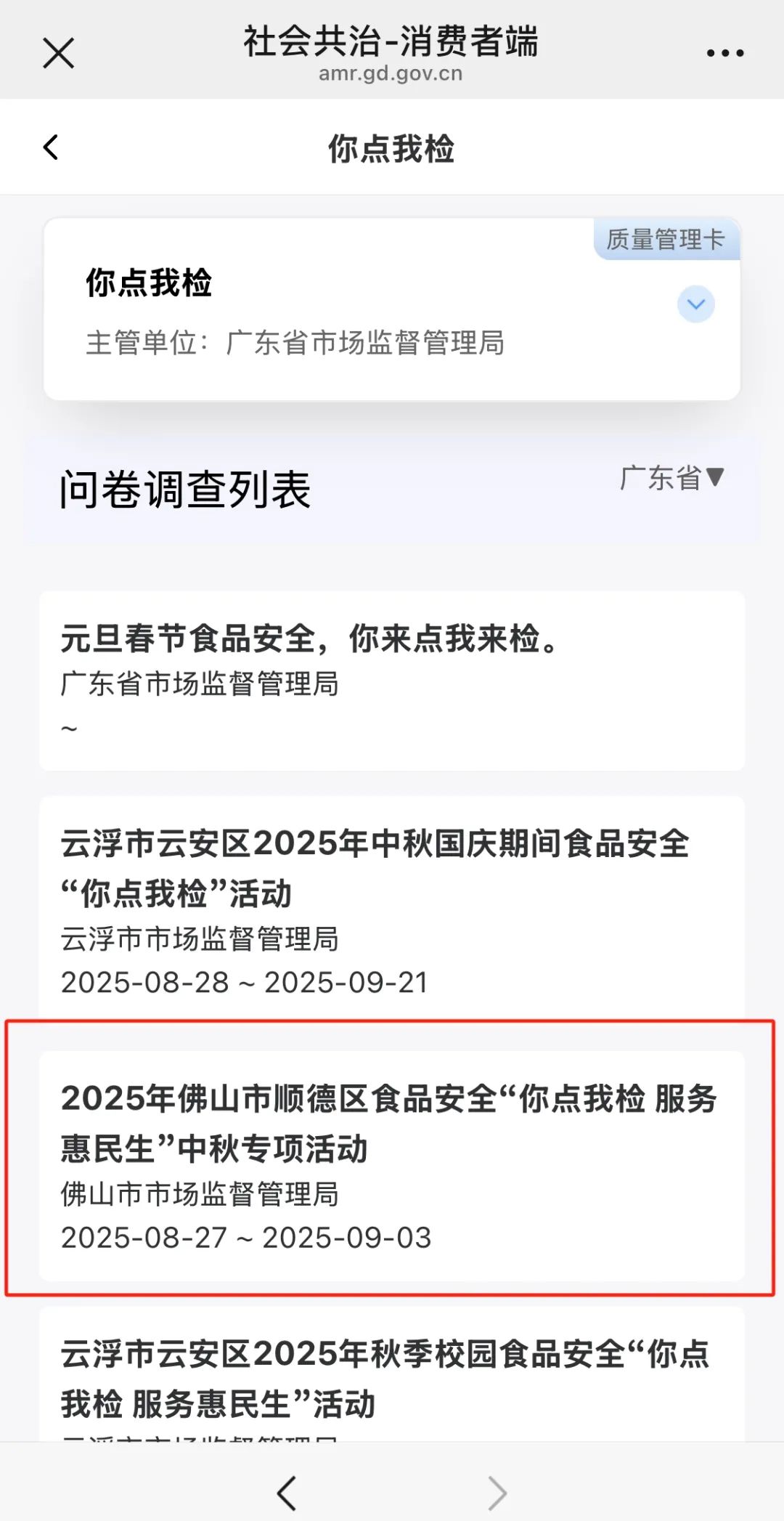 点击【2025年佛山市顺德区食品安全“你点我检 服务惠民生”中秋专项活动】进入投票页面。
