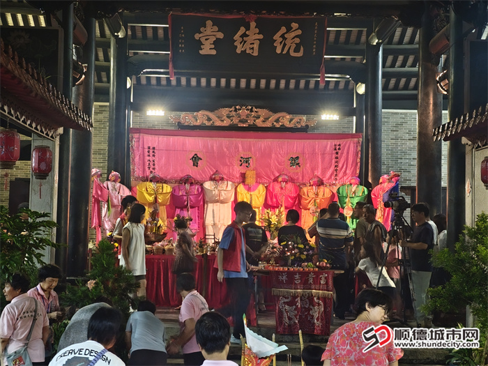 当晚正值七夕前一晚,也是当地所说“大慕”的日子,在沙头社区的黄氏大宗祠内聚满了前来“拜七姐”的群众。在这里,传统“摆七姐”民俗完整再现了古代女子的巧手技艺,通过自梳女手工艺品展示、祈福仪式等环节,让游客近距离感受岭南独特的七夕文化传承,更展示了沙头社区深厚的文化底蕴。