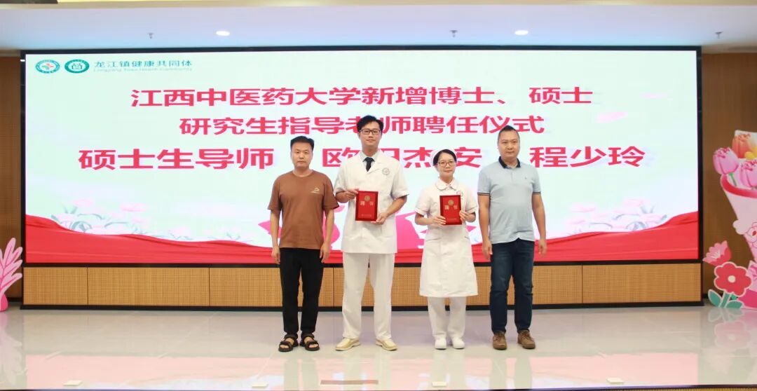 江西中医药大学教学处实习科科长简建辉、龙江镇卫健办副主任张建斌为新增的硕士研究生导师颁发聘书。
