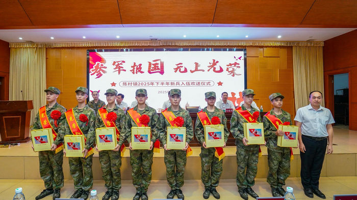 少年当有鸿鹄志,家国情怀正青春。9月14日下午,陈村镇召开2025年下半年新兵入伍欢送大会,全镇共同为即将奔赴军营的新一批优秀青年送行。陈村镇全体党政人大领导班子成员、机关各办所负责人、镇征兵办相关工作人员,各村居党组织书记、“两委”干部,以及新兵家属代表齐聚一堂,用最真挚的祝福,见证这群热血青年的“戎装启航”时刻。