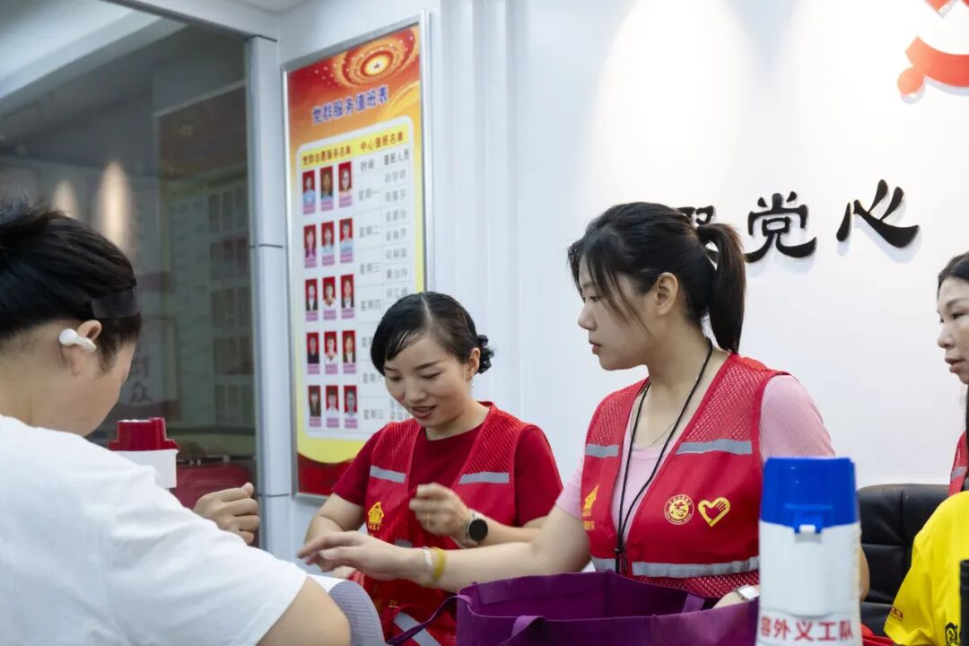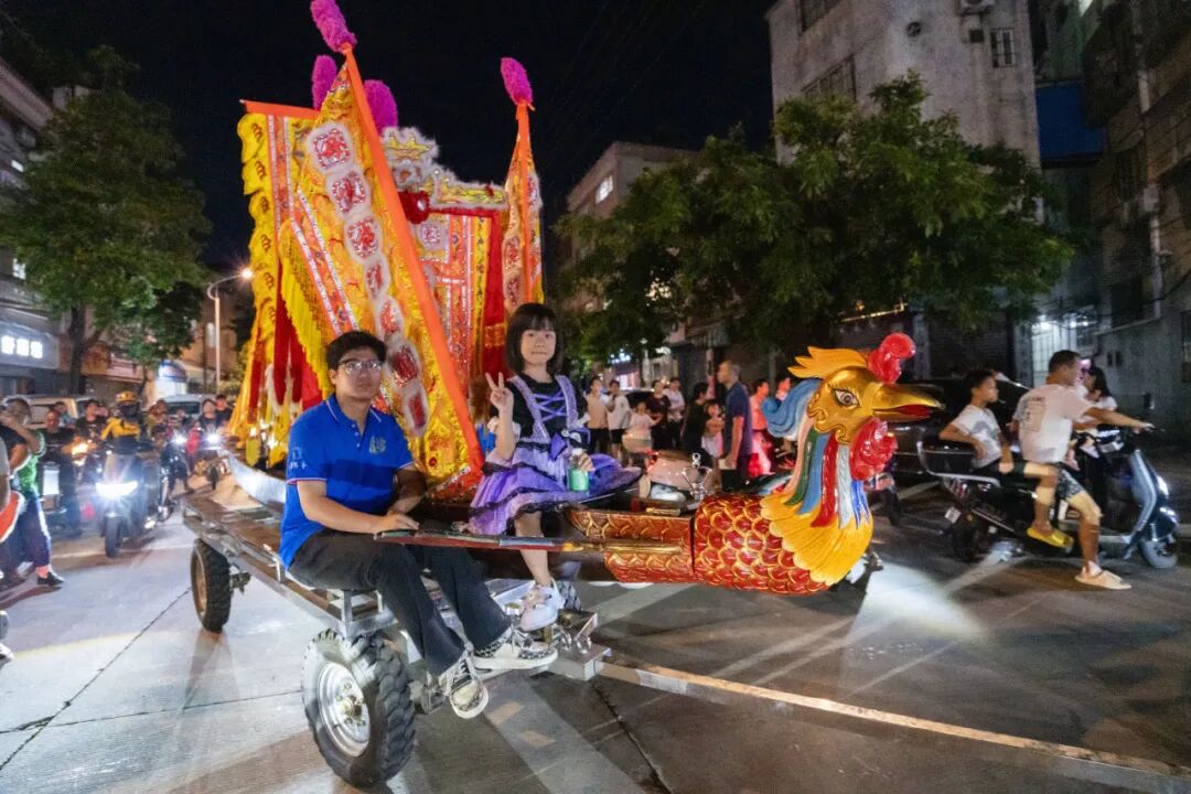 在巡游活动中,身穿红马甲的大福基社区志愿者在队伍前后两侧护航,提醒过往行人注意安全,并为群众喷蚊水,做好防护安全措施。