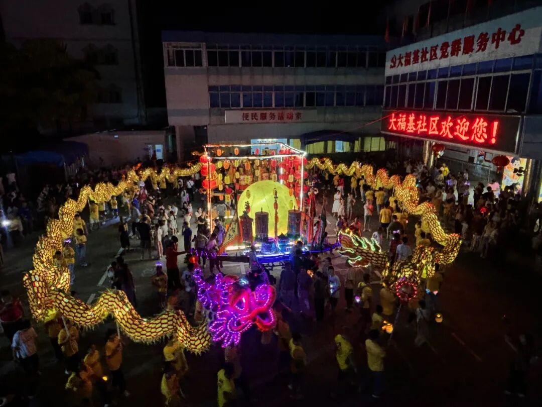 2025年10月6日晚,大福基社区党委、大福基社区居民委员会、大福基社区新时代文明实践站、大福基社区德兴龙狮协会联合举办“喜舞彩龙·祥聚宝地”大福基社区百米夜光长龙活动。数百名居民手提灯笼,汇聚成一条流淌的“地上星河”,与空中翻腾的夜光长龙遥相呼应,共同绘就一幅温馨震撼、邻里同欢的团圆画卷。
