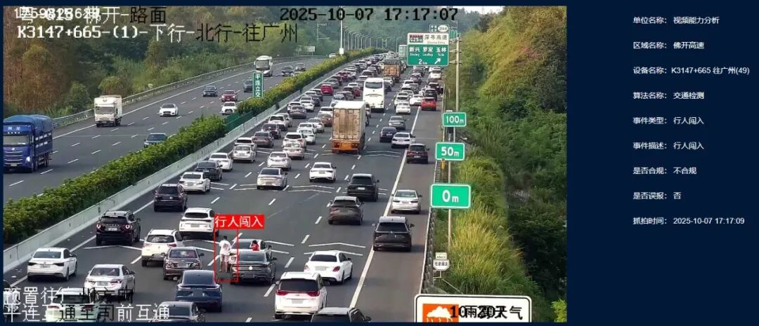 佛开高速等多个路段布设视频枪接入AI智能感知系统,启用定向广播对涉事车辆及人员进行语音警示和劝离,有效化解和防止次生事故,提升道路通行能力,为过往司乘人员铺就一条条安全、畅通的返程之路。