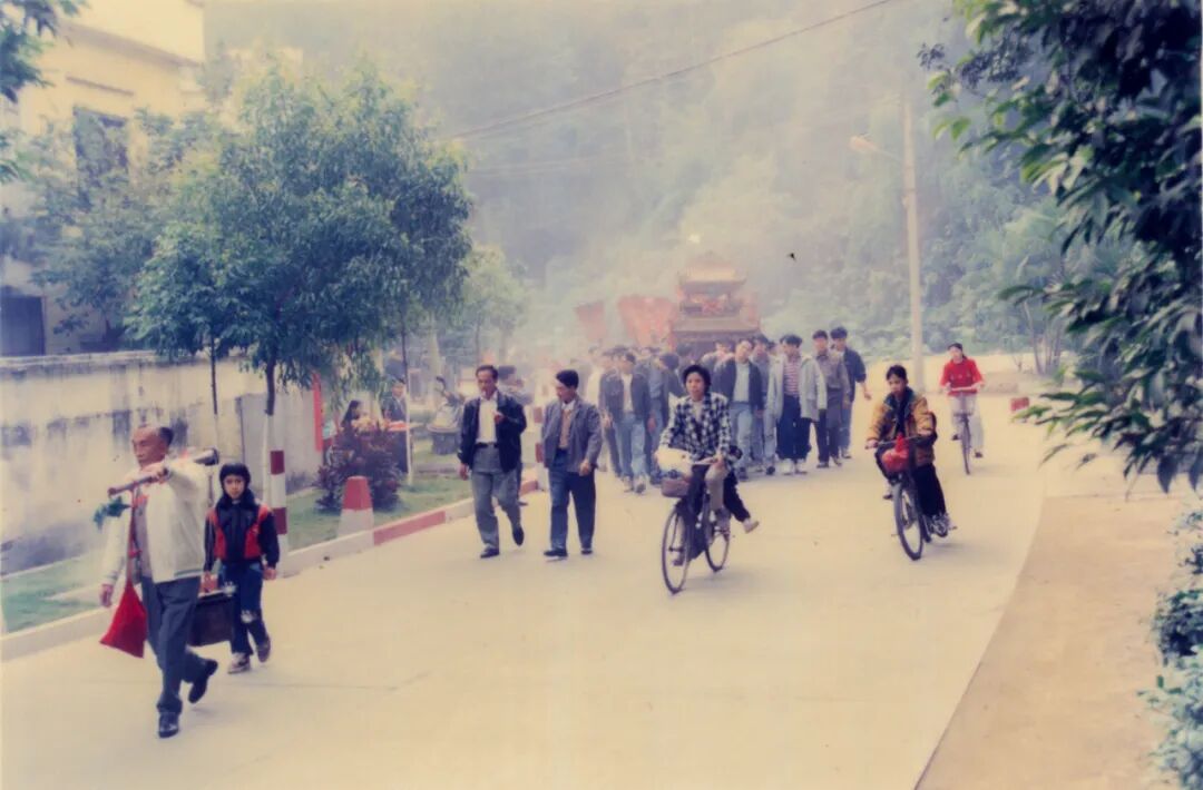1989年“关帝侯王出游”期间,村民抬着銮舆走在村道上。