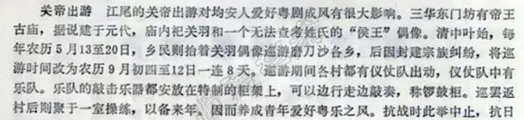 1991年《顺德均安志》称,自清中叶开始就有三华帝王古庙关帝出游8天的活动,“巡游期间各村都有仪仗队出动,仪仗队中有乐队”,可见气氛热烈。