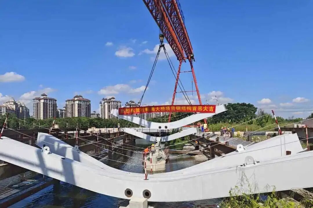 据中国铁建港航局消息,今年9月中旬,桂畔海大桥项目顺利完成首个钢拱肋吊装施工,大桥建设取得突破性进展。