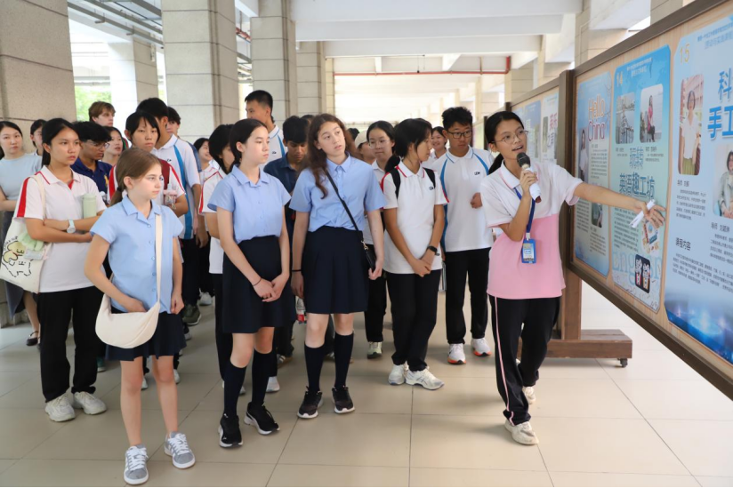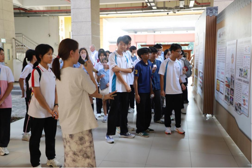 在学生代表的引导下,英方来宾步入校训大堂,聆听学校办学理念与校训精神。通过教师的系统介绍,客人们对学校的办学特色与发展历程有了清晰了解。学生代表则生动讲解了学校丰富的校本课程,分享了同学们在不同课程中的学习收获。