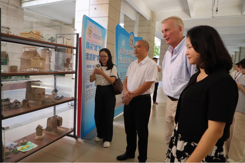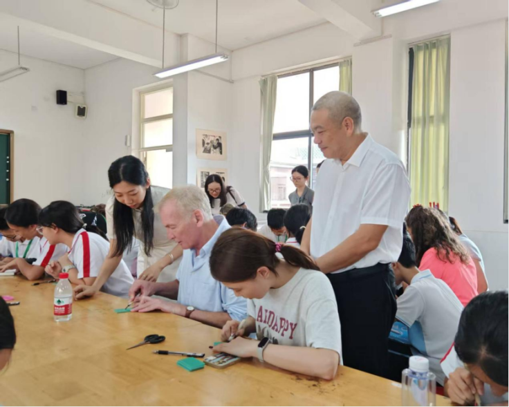 行程中,精彩的特色作业展示吸引了众人的目光。英国Winchmore School副校长诺埃尔·汤姆森先生对学生制作的精美模型表现出浓厚兴趣,频频驻足询问。