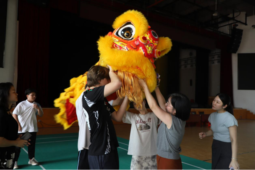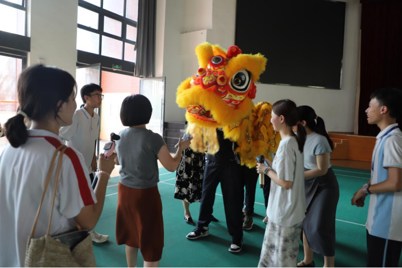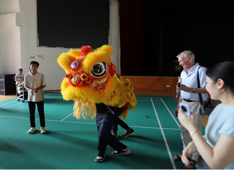 当铿锵的锣鼓声响起,访问活动迎来了第一个高潮——精彩的舞狮表演。矫健的雄狮随着鼓点腾挪闪转,瞬间点燃了现场气氛。在热烈的掌声中,英国学生们更是受邀上场,亲身体验舞狮动作。他们举起狮头,模仿步伐,在欢乐的尝试中深度感受了中国传统民俗文化的独特魅力。