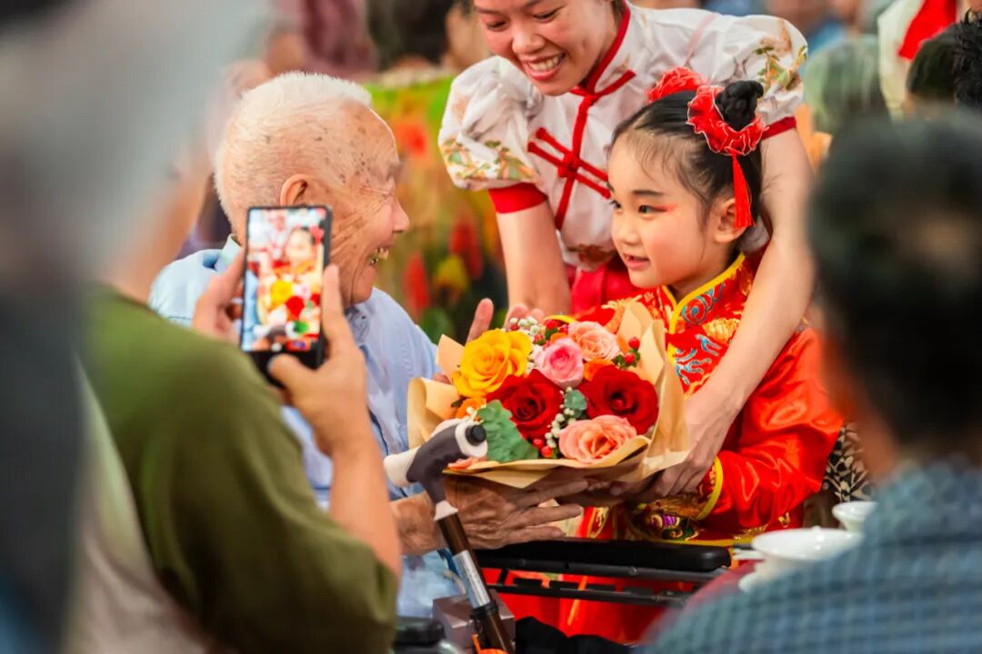 小朋友向长者致赠鲜花。